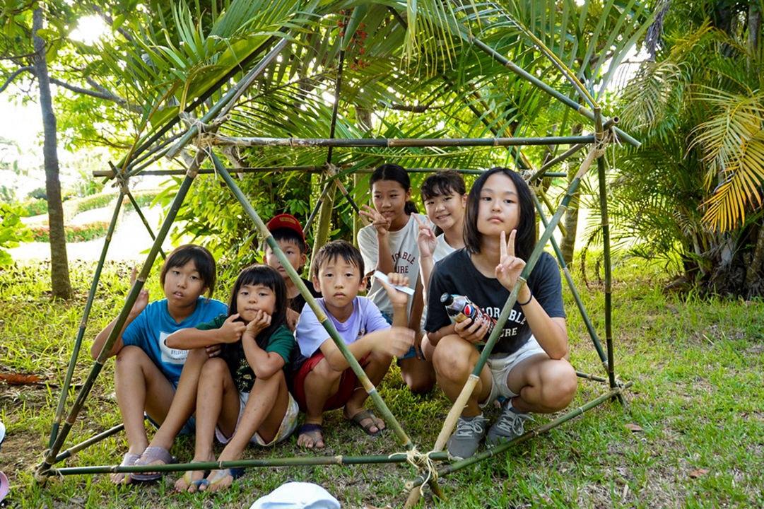 小浜島の小学生14名、中学生2名が参加して、南の島で建築を学ぶというワークショップを開催しました。まず最初に「建築ってなに?」「建築と風邪や熱」というレクチャーを聞いた後、はいむるぶしのカンファレンスルームで、実際に敷地内の植物(竹と月桃)を使って、島っこハウス(ドーム)作りを体験しました。